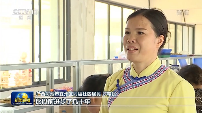 广西河池市宜州区同福社区居民 罗艳妮:搬出了大山,住上了楼房,在家门口有了工作,生活条件可以说是比以前进步了几十年。