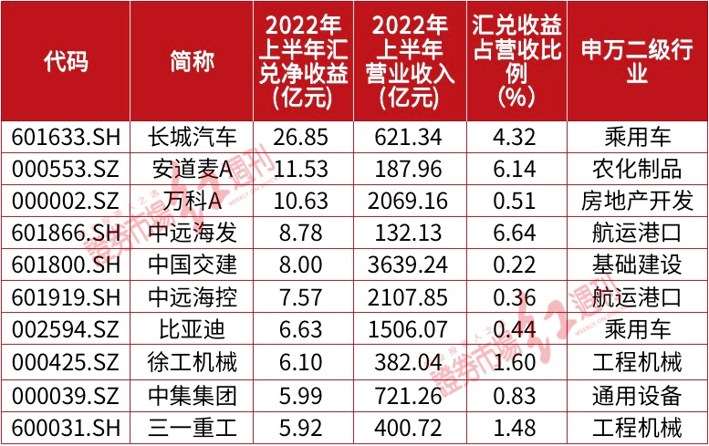 受益人民币贬值的主要是出口型公司,受益居前的是长城汽车,长城汽车上半年海外销售6.8万辆,收入93亿元,占营收的15%,其中汇兑净收益26.8亿元,占营收的4.3%。其次是安道麦A,是先正达集团旗下的全球性农药公司,公司长期利用远期合同和期权进行汇率的风险对冲,今年上半年汇兑净收益11.53亿元,占营收的6.1%。