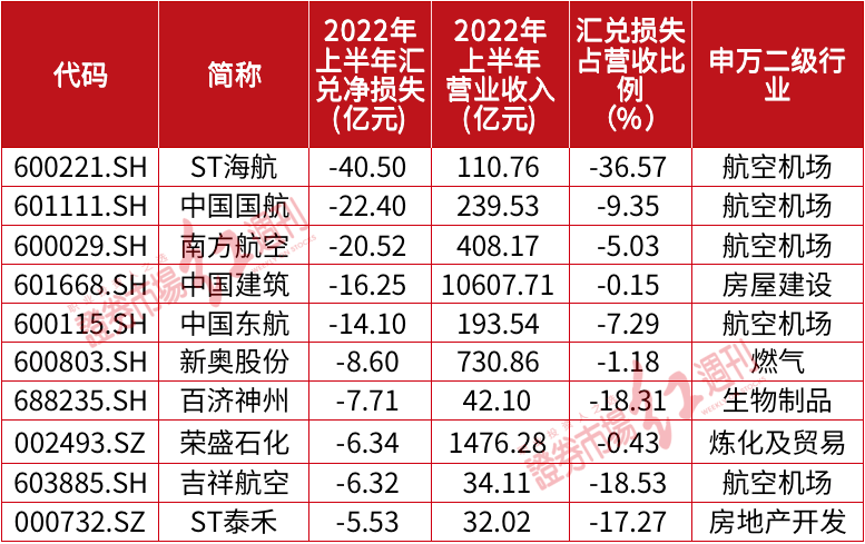 受损最大的行业当属航空公司,中国国航、南方航空、中国东航等有不少国际航线,再加上飞机租赁,贷款购买等情况使用美元,因此受贬值的影响较大。某航空公司在中报里这样描述汇兑风险,“公司大多数的租赁债务及部分贷款以外币结算(主要是美元,其次是欧元),并且公司经营中外币支出一般高于外币收入”,公司还提到“截止2022年6月30日,就本公司各类美元金融资产和美元金融负债而言,如果人民币兑美元升值或贬值5%,其它因素保持不变,则本公司将增加或减少税前利润约38.87亿元。”