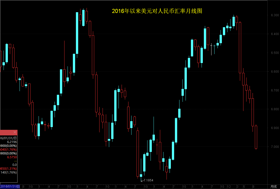 今年以来人民币兑美元持续贬值,9月16日在岸人民币兑美元“破7”,最低7.025。相对于年初人民币兑美元的1:6.35,目前的贬值幅度超过10%。美元兑人民币汇率2016年以来出现过三次贬值,二次升值,波动范围在6.3-7.18之间。