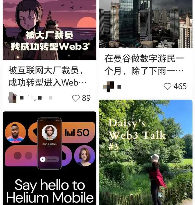已经有越来越多的互联网人投奔Web3。他们中的很多都活跃在小红书里,根据自述,或因项目解散而失业,或是厌倦了“内卷”的办公室生活。内容节奏也大体相似,如同使用了同一家培训学校的模版:通过转型故事树立人设、分享Web3碎片化知识、引流拉群。