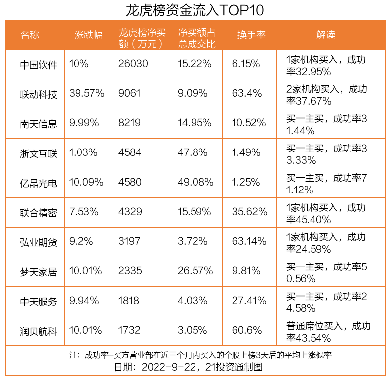 9月22日,上证指数下跌0.27%,深证成指下跌0.84%,创业板指下跌0.52%。盘后龙虎榜数据显示,共有38只个股因当日异动登上龙虎榜,资金净流入最多的是中国软件(600536.SH),达2.6亿元。