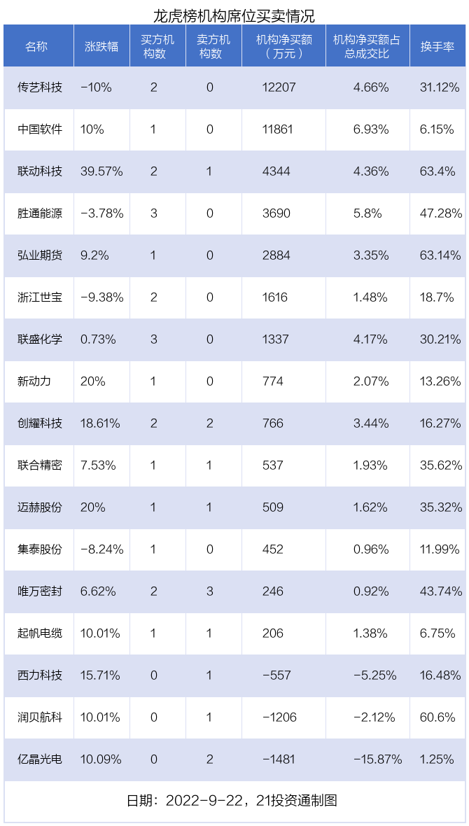 9月22日,17只个股龙虎榜出现了机构的身影,机构合计净买入3.82亿元。具体来看,机构净买入14股,净卖出3股。