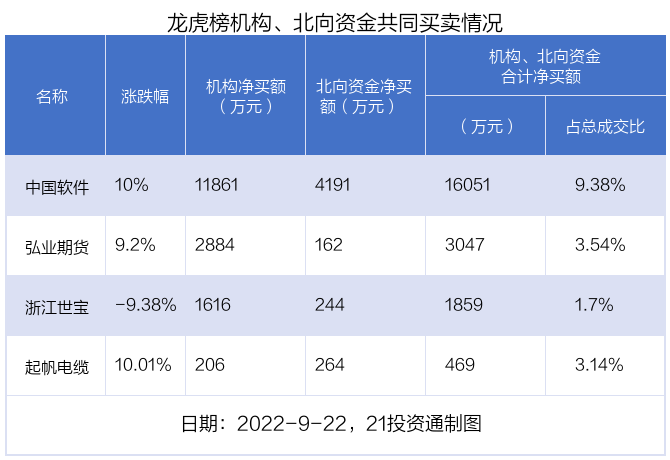 值得注意的是,机构和北向资金共同净买入了中国软件、起帆电缆、浙江世宝、弘业期货4股。