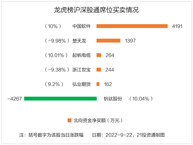 9月22日,北向资金参与龙虎榜中的个股共有6只,合计净买入1990.52万元。其中沪股通净买入2 股,合计金额为4454.34万元;深股通净买入3 股,净卖出1 股,合计净卖出2463.82万元。