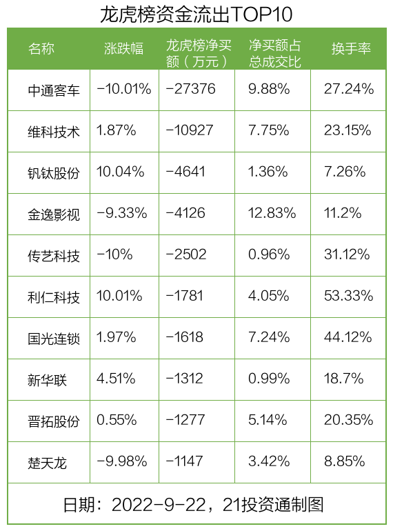 而龙虎榜中资金净流出最多的是中通客车(000957.SZ),被净卖出为2.74亿元,占总成交金额的9.88%。中通客车收盘下跌10.01%,换手率为27.24%。