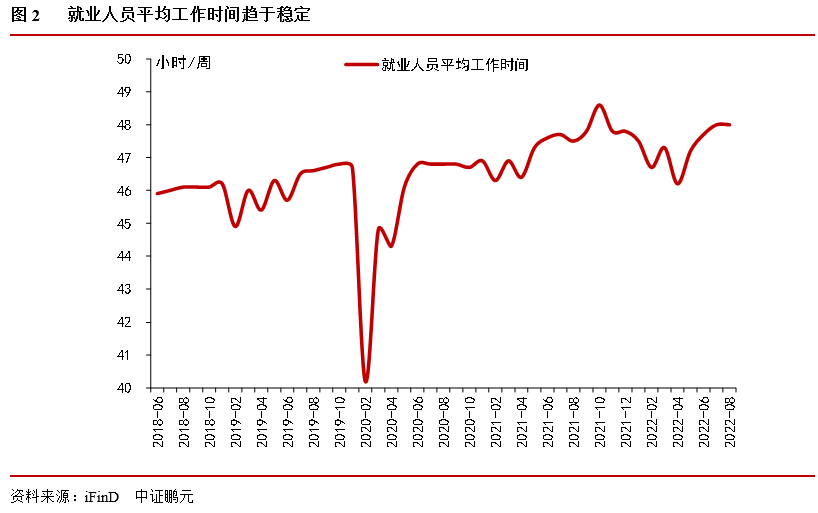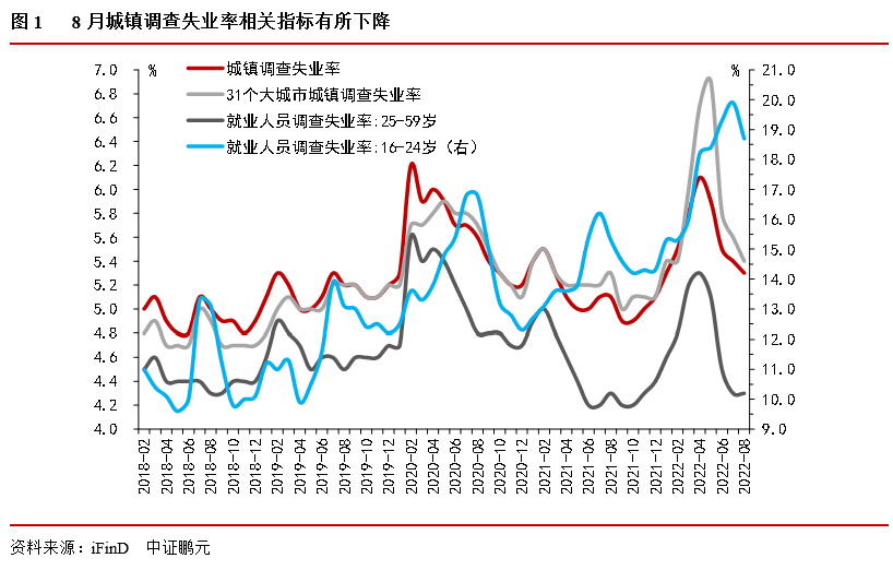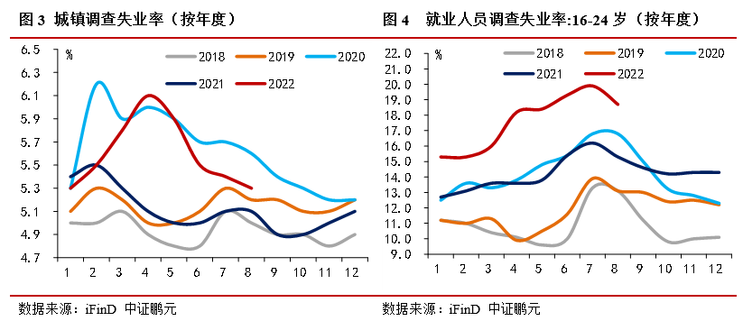 8月份全国城镇调查失业率为5.3%,比上月降低0.1个百分点,连续四个月下滑。31个大城市城镇调查失业率为5.4%,比上月降低0.2个百分点,连续三个月回落。其中,16-24岁、25-59岁人口调查失业率分别为18.7%、4.3%,较前值分别下降1.2个百分点与持平,16-24岁青年人口调查失业率从历史最高点回落,但仍居历史第三高位且显著高于季节性水平。全国企业就业人员周平均工作时间为48.0小时,较前值持平。总的来看,在稳就业帮扶政策持续发力情况下,8月城镇调查失业率继续下降,总体就业形势趋于好转,青年人失业率有见顶回落趋势但结构性就业压力仍大。今年政府工作目标是城镇新增就业1,100万人以上,城镇调查失业率全年控制在5.5%以内,1-8月份,全国城镇新增就业898万人,预计后续就业压力将明显缓和,完成全年就业目标的难度不大。