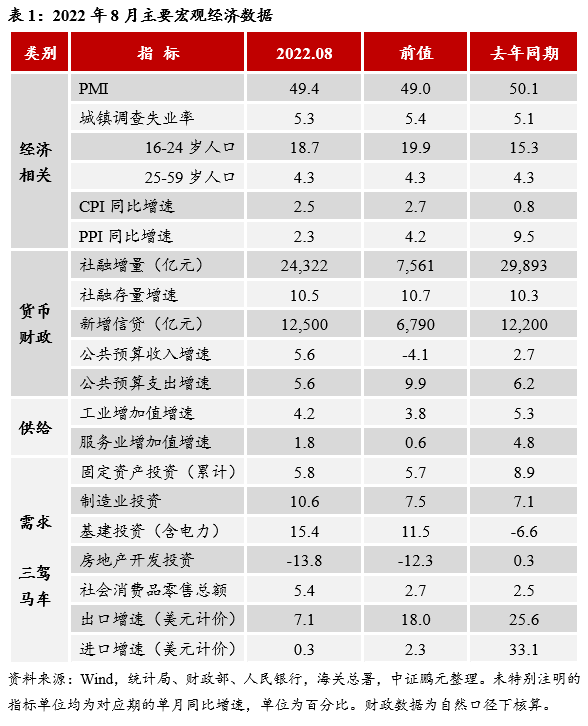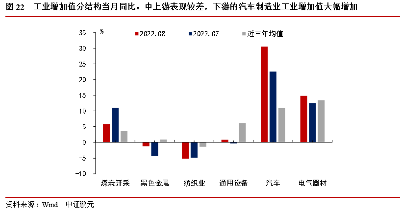 8月,规模以上工业增加值同比增长4.2%,较前值上升0.4个百分点,同比数值有所上升,主要在于去年低基数;全国服务业生产指数同比增长1.8%,比上月上升1.2个百分点。工业增加值季调环比增长0.32%,较前值0.38%小幅回落。因制造业在工业中的重要地位,制造业PMI生产指数(本质也是环比指标)与工业增加值环比走势正相关,8月PMI生产指数为49.8%,较前值持平且未到临界值以上。1-8月工业增加值累计同比增长3.6%,较前值小幅回升0.1个百分点。总体看,在高温限电、疫情反弹的情况下,供给端工业和服务业小幅上升,恢复基础仍需巩固。从工业增加值结构上看,上游原材料产品表现较差,中游材料和设备表现次之,下游受政策支持的汽车及电气器材制造业表现突出,同比增速高达30.5%和14.8%。