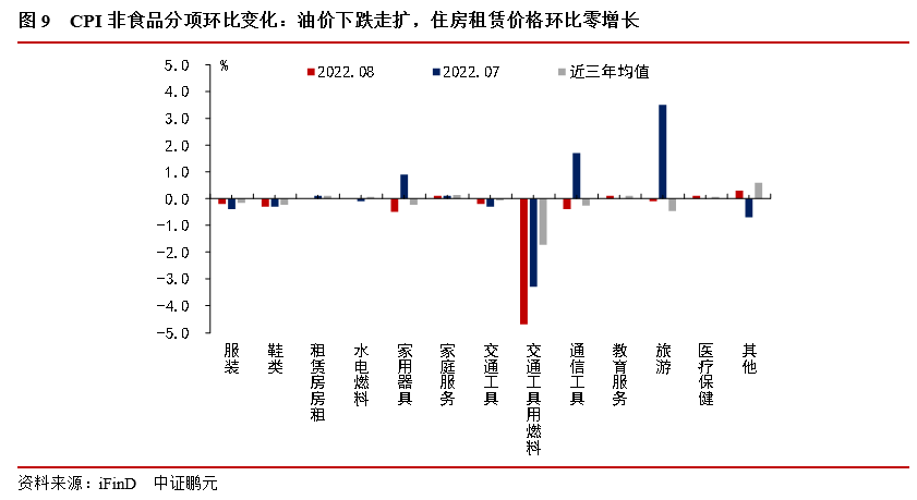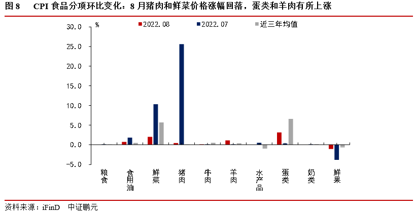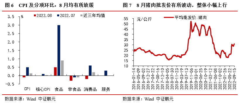 8月全国居民消费价格CPI同比上涨2.5%,涨幅比上月回落0.2个百分点,扣除食品和能源价格的核心CPI同比上涨0.8%,涨幅与上月持平。从环比看,CPI由上月上涨0.5%转为下降0.1%,核心CPI由上月上涨0.1%转为上涨0.0%,8月通胀环比水平下滑,通胀压力阶段性缓和。从分项来看,食品价格上涨0.5%,涨幅比上月回落2.5个百分点。其中,猪肉价格上涨0.4%,涨幅比上月大幅回落25.2个百分点,主因供给逐步恢复,发改委启动了多轮猪肉储备投放,抑制猪肉价格的过快上涨,8月末全国猪肉批发价格为29.86元/公斤,较月初仅上涨0.59元/公斤;受高温干旱天气,鲜菜价格上涨2.0%,低于季节性水平;鸡蛋和鲜果价格均呈季节性变动,分别上涨3.5%和下降1.0%。非食品价格下降0.3%,降幅比上月扩大0.2个百分点,大宗商品价格有所回落,交通工具燃料下降4.7%,降幅扩大1.7个百分点。租赁房房租和家庭服务同比和环比均有所下滑,显示终端需求仍偏弱,租赁房房租同比-0.5%,环比0%,较前值均下滑0.1个百分点;家庭服务同比2.6%,环比0.1%,分别较前值下滑0.1个百分点和持平。