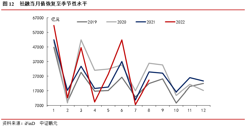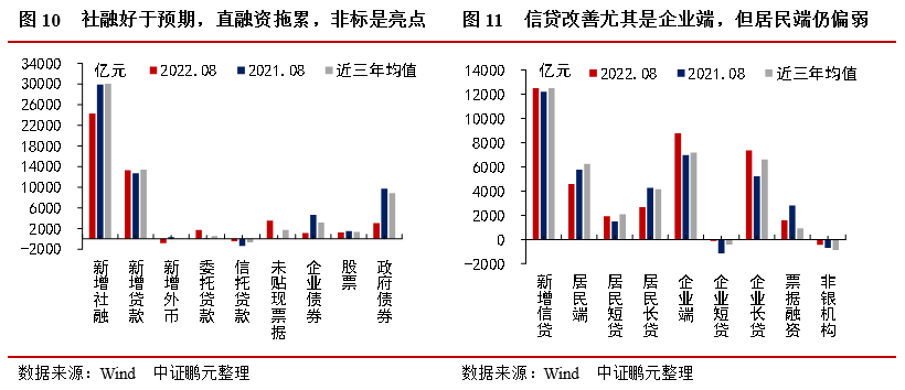 8月新增人民币贷款1.25万亿元,持平季节性水平,同比多增390亿元。居民端信贷仍较弱,加杠杆意愿不够,居民端贷款同比少增1,175亿元,其中居民中长期贷款同比少增1,601亿元,指向房地产市场依然低迷。企业端融资结构有改善,表内票据冲量有减少,企(事)业单位贷款同比多增1,787亿元,其中短期贷款同比少减1,028亿元,中长期贷款同比多增2,138亿元,票据融资同比少增1,222亿元。