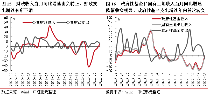 公共财政收入有所好转。按自然口径计算,8月全国一般公共预算收入单月同比增速为5.6%,增速由负转正,4-7月单月增速分别为-41.3%、-32.5%、-10.6%、-4.1%;1-8月累计同比-8.0%(前值-9.2%),扣除留抵退税因素后,1-8月累计增长3.7%,较前值上升0.5个百分点。