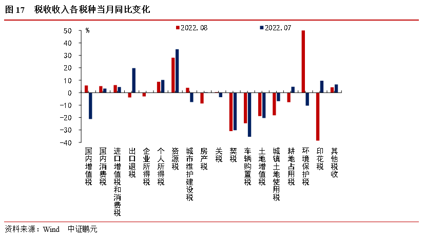 增值税和环境保护税拉动作用明显。主要税种方面,四大主要税种中,按自然口径,8月国内增值税同比增速由7月的-21.2%上升至5.7%,8月国内消费税、企业所得税、个人所得税同比增速分别5.2%(前值为3.3%)、-3.0%(前值为0.1%)、8.8%(前值为10.2%)。出口退税受出口下滑影响,增速由19.7%大幅下滑至-3.8%。环境保护税增速最高,8月当月同比增速为50.0%,较上月上升60.4个百分点。土地和房地产相关税收延续较差趋势,8月契税、土地增值税、房产税、耕地占用税、城镇土地使用税同比增速分别-31.0%(前值为30.2%)、-18.8%(前值为-20.4%)、-8.7%(前值为0.3%)、-7.7%(前值为4.8%)、-18.2%(前值为-6.8%)。