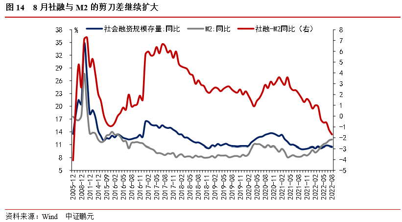 M2同比增长12.2%,增速分别比上月末高0.2个百分点;M1同比增长6.1%,增速比上月末低0.6个百分点。M2增速继续走高,M1增速下滑,M2与M1剪刀差走扩,居民和企业存款继续同比多增,表明市场预期仍弱,风险偏好低和实体经济活力不足。