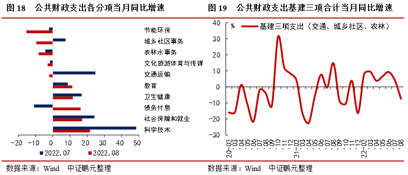 公共财政支出放缓,基建三项支出今年以来首次由正转负。8月全国公共财政支出当月同比增长5.6%,前值为9.9%,累计同比6.3%,较前值小幅回落0.1个百分点。在财政收入下滑情况下,专项债发行空挡,财政支出出现一定下滑。分结构来看,10个支出分项中当月同比增速由高至低:科技21.6%(前值48.5%)、社保就业17.0%(前值24.2%)、债务付息16.2%(前值-10.9%)、卫生健康11.6%(前值16.7%)、教育11.4%(前值8.7%)、交通运输-2.1%(前值24.8%)、文旅体育传媒-3.0%(前值-1.6%)、农林水事务-8.2%(前值-4.4%)、城乡社区-9.6%(前值7.4%)、环保-15.4%(前值-2.2%)。本月基建支出(交通运输、城乡社区、农林水)表现较差,8月增长-7.4%,前值为4.2%,是今年以来首次表现负增长,主要原因是今年财政发力靠前,财政收入放缓,叠加防疫、社保、卫生的刚性支出挤兑,基建支出力度有所下降,预计后续将主要通过政策在开发工具来延缓下滑趋势。注意,统计局的广义基建投资增速单月增加达到了15.4%,这与财政口径的单月基建支出并无太大关系。