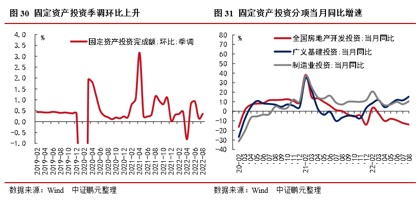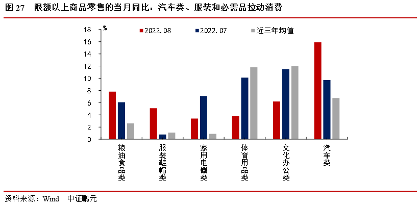 (1)8月社会消费品零售总额同比读数虽然改善较大但主因在于去年的低基数,而单月环比增速-0.05%且明显低于季节性水平,总体已经开始低位企稳,后续同比增速仍有上升趋势,但重点关注环比增速的变化。受扶持的汽车类消费同比增长15.9%,是2021年5月以来的最高点,成为拉动消费的主要分项。