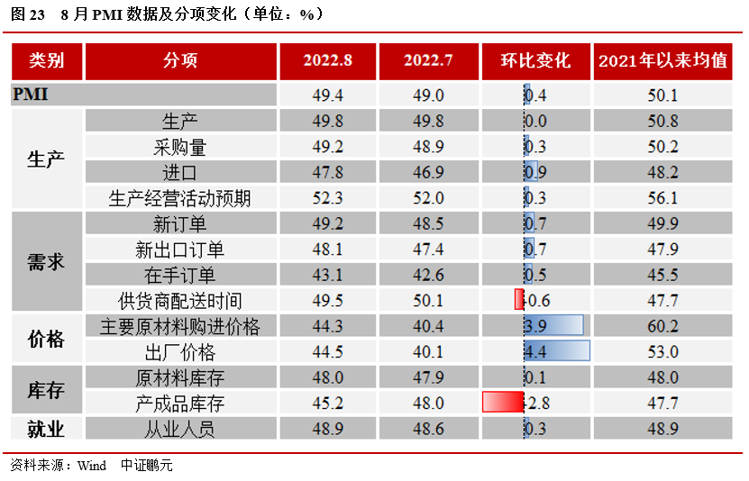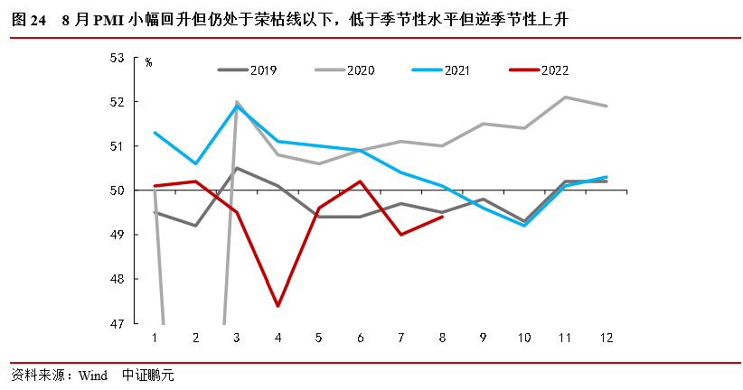 8月份,制造业采购经理指数PMI指数为49.4%,比上月上升0.4个百分点,2020年和2021年同期环比分别是下降0.1个百分点和0.3个百分点,制造业景气有所改善但仍处于荣枯线以下。