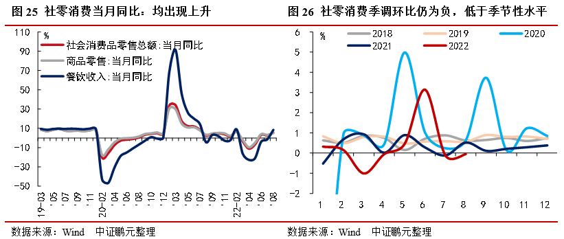 从消费来看,8月社会消费品零售总额同比增长5.4%,比上月上涨2.7个百分点。其中餐饮收入同比上涨8.4%,前值为-1.5%,今年3月以来首次转正,主因多地发放消费券、居民暑期出行和就餐活动增多。商品零售同比增长5.1%,较前值上升1.9个百分点。汽车类消费同比增长15.9%,较前值上升6.2个百分点,是2021年5月以来的最高点,成为拉动消费的主要分项。社零同比读数虽然改善较大但主因在于去年的低基数,而单月环比增速-0.05%且明显低于季节性水平,较前值降幅收窄但仍是负增长。8月多地爆发疫情,消费改善幅度有限,但总体已经开始低位企稳,后续同比仍有上升趋势,但重点关注环比增速的变化。
