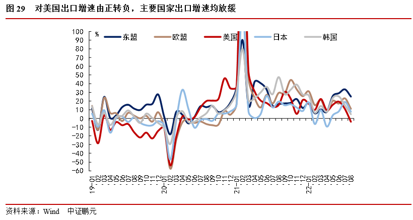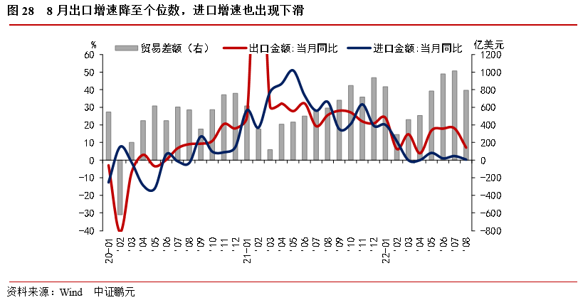 从外贸来看,8月三大需求中,仅有出口形成拖累。按美元计价,8月出口同比增长7.1%,前值为18.0%;进口同比增长0.3%,前值为2.3%;贸易顺差为793.9亿美元,前值1,012.6亿美元。今年以来,出口增速持续维持高景气,8月的下滑是有预计的(我国出口结构与韩国、越南相似),因疫情后恢复基础不牢,海外高通胀和强加息后需求被压制等因素,叠加去年的高基数,前期外贸订单的快速释放。价格对出口贡献率开始转弱至63%。8月出口环比增速为-5.3%,较前值增速0.7%由正转负下降明显,且明显弱于季节性。对美国的出口增速自2020年6月以来首次由正转负,由7月11.0%增速回落至8月的-3.8%,对东盟出口增速仍处高位,达到了25.1%。从出口产品来看,海外的消费品需求走低,但汽车仍维持46.7%的高增速,防疫用品出口增速转负。进口增速维持0.3%的低位,与国内需求不足,高温、部分地区限电有关。总的来说,在高基数和海外需求放缓等情况下,四季度出口仍有不确定性,大概率维持下滑趋势,应积极开拓东盟市场,保障产品和供应链的稳定性,尽最大可能维持出口份额和保持韧性。
