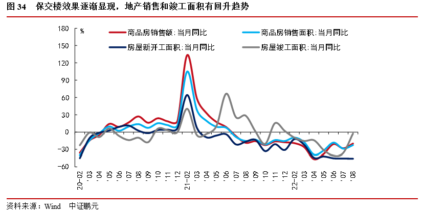 (3)整体而言,本月投资表现好于消费、出口和工业增加值。基建投资是今年稳增长的首要抓手,广义基建投资当月增速达到了15.4%。专项债发行在8月结束,后推出8,000亿政策性信贷额度和6,000亿以上的政策性金融开发工具,目前首批额度投放完毕,10月将发行5,000亿元专项债,将有力支撑基建投资资金。制造业投资单月同比增长10.6%,增速比前值上升3.1个百分点,今年以来表现较强韧性,尤其是转型相关的高技术制造业支撑作用强。近期国常会决定延长制造业缓税补缴期限,确定专项再贷款等支持设备更新改造,后续制造业投资仍将保持较快增长。地产投资增速仍在下行,需求端处低位改善不明显,居民信心和购房意愿不足,但供给端有所改善,在房贷利率降低,地方“一城一策”,保交楼专项借款等政策加持下,8月商品房销售面积较前值收窄6.3个百分点,房屋竣工面积增速为-2.5%,是今年的最高值,较前值大幅收窄33.5个百分点,可见“保交楼”效果开始逐步显现。预计今年后续地产投资仍处底部徘徊,而需求端逐步修复。