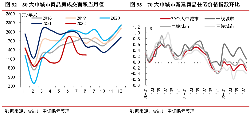 8月,房地产开发投资当月增速为-13.8%,是今年以来的最低点,较前值继续下降1.5个百分点,地产投资增速仍在下行。需求端处低位改善不明显,居民信心和购房意愿不足,8月30大中城市商品房成交面积继续下行,较前值减少78万平米,且成交面积明显低于近年来的平均水平。70个大中城市中新建商品住宅和二手住宅销售价格环比下降城市比上月分别增加10个和5个。但供给端有所改善,在房贷利率降低,地方“一城一策”,保交楼专项借款等政策加持下,8月商品房销售面积增速为-28.9%,较前值收窄6.3个百分点,房屋竣工面积增速为-2.5%,是今年的最高值,较前值大幅收窄33.5个百分点,可见“保交楼”的效果开始逐步显现。考虑到销售和投资滞后性,预计今年后续地产投资仍处底部徘徊,需求端逐步修复。