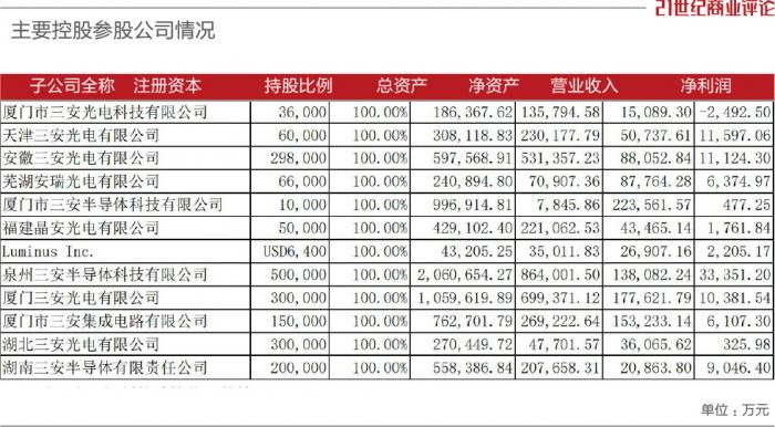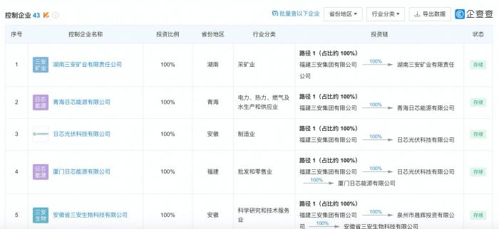 工商信息显示,三安集团直接控股43家企业,间接控股996家。