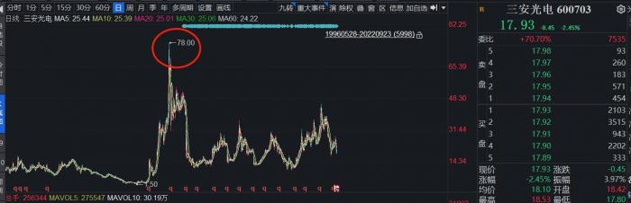 随后几年,三安光电股价一路飙升,最高站上78元。