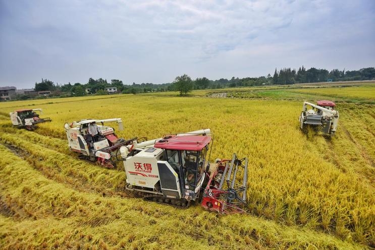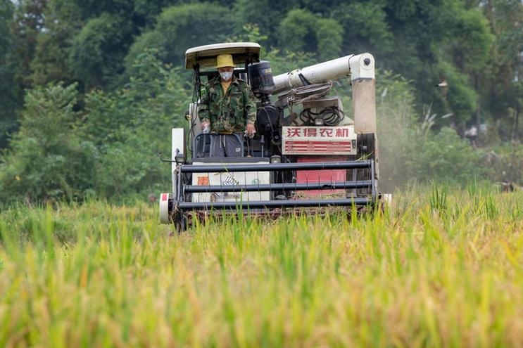 9月21日,在四川省崇州市道明镇新华村,村民驾驶农机收割水稻。新华社记者 胥冰洁 摄