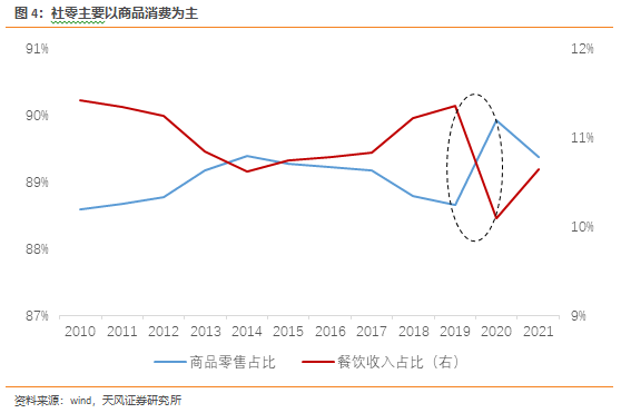 社零是指企业直接出售给个人和社会集团(包括企事业单位、机关、部队、社会团队等)的非生产、非经营用实物商品以及提供餐饮服务的所取得的收入,是站在卖方视角,统计卖了多少商品。从构成上看,2021年社零消费中,商品占比89%,餐饮占比11%。