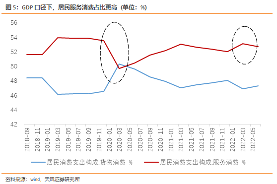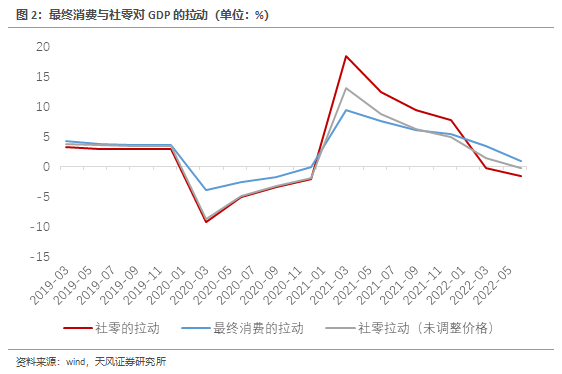 但GDP口径的最终消费在疫情之后的韧性却远高于社零。2019年,最终消费对GDP的拉动率高于社零对GDP的拉动率约0.8个百分点(这和社零占GDP比重低有关)。但在疫情之后,两者的差距明显走阔。2020年上半年最终消费对GDP的拉动高于社零4个百分点,2022年上半年最终消费对GDP的拉动高于社零3个百分点。