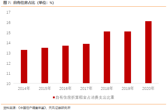 所以疫情以来,最终消费表现好于社零,主要是最终消费里的政府消费和虚拟消费受疫情影响小。如疫苗核酸防疫等卫生支出等政府消费在疫后明显提高,体现在数据上是最终消费增速从2019年的9.2%下滑至2020年的1.5%,其中,居民消费增速从9.3%下滑至0%,但政府消费增速仅从8.8%下滑至5%。虚拟消费主要是自有住房折算租金,这类消费几乎不受疫情影响。2020年,该科目占居民消费支出的比重为16.1%,且占比整体会随着居民自有住房面积的增加而增加。