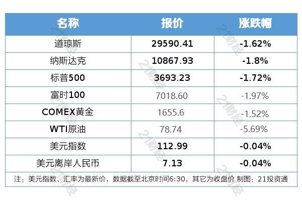 上周五,纽约股市三大股指显著下跌。截至23日收盘,道琼斯工业平均指数比前一交易日下跌486.27点,收于29590.41点,跌幅为1.62%;标准普尔500种股票指数下跌64.76点,收于3693.23点,跌幅为1.72%;纳斯达克综合指数下跌198.88点,收于10867.93点,跌幅为1.80%。