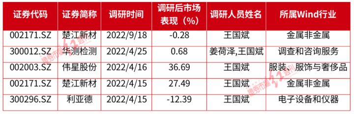 值得一提的是,在今年4月15日,王国斌也曾亲自现身调研过楚江新材(见表2)。而在此之后,楚江新材股价触底反弹。截至目前,累计上涨超过了25%。本轮的调研,是王国斌的二次造访。此外,在王国斌调研过后,多家公司同样迎来大涨,如伟星股份,自4月16日至今已上涨36.69%。