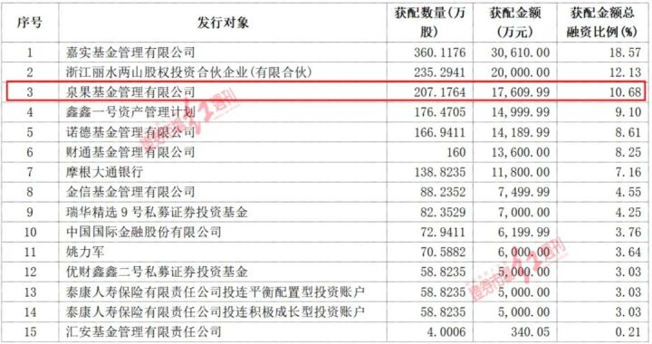 江丰电子于9月22日披露的定增报告书透露了王国斌的泉果基金最新投资动向。据江丰电子披露的定增结果,江丰电子此次以85元/股为发行价格发行1939.41万股股份,募资16.48亿元,发行对象为15名。其中,泉果基金获配207.17万股,在15名发行对象中排名第三位,获配金额1.76亿元,获配金额占总融资比例为10.68%(见表1)。