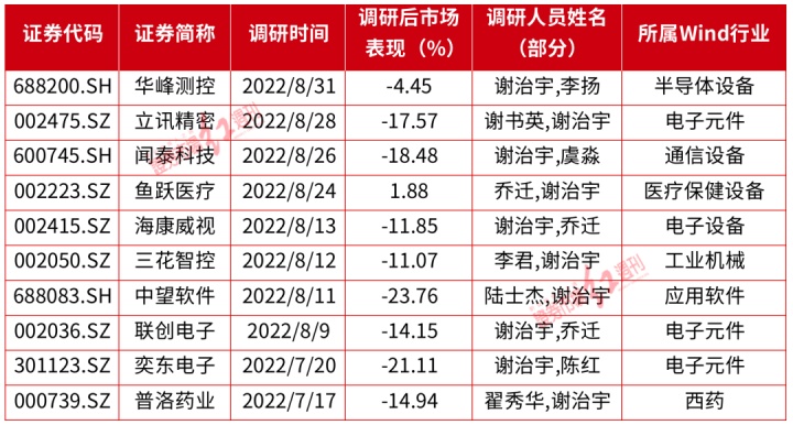 除了忙于定增,谢治宇也频频出现在上市的调研名单中。据Wind数据不完全统计显示,下半年以来,谢治宇共出现在华峰测控、立讯精密、闻泰科技、鱼跃医疗、海康威视、三花智控等10家公司的调研名单中(见表5)。