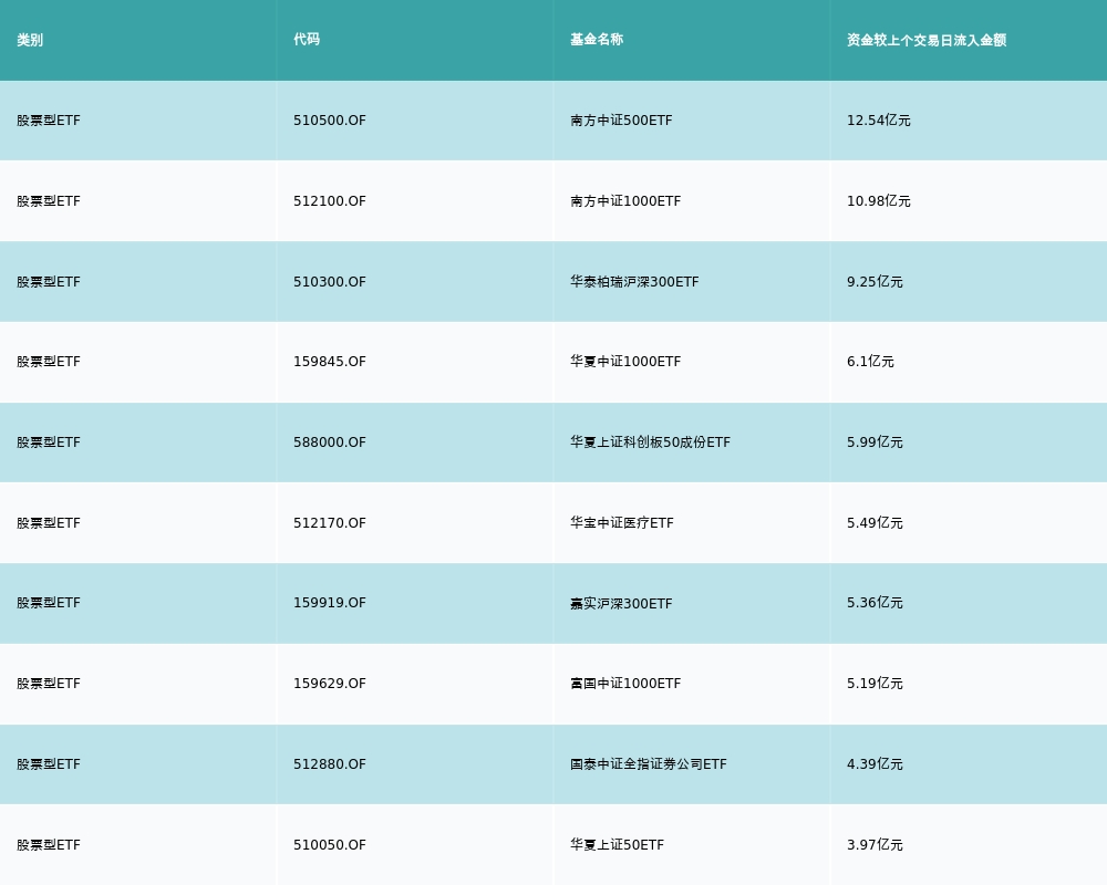 昨日股票型ETF资金流入最多的3支ETF及其流入金额分别为:南方中证500ETF(流入12.54亿元)、南方中证1000ETF(流入10.98亿元)、华泰柏瑞沪深300ETF(流入9.25亿元)。资金流入前10详情见下表: