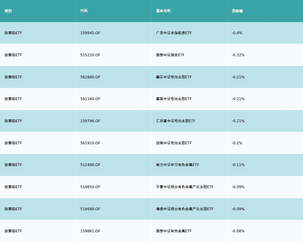 昨日股票型ETF跌幅最大的3支ETF及其收益率分别为:广发中证全指能源ETF(-0.4%)、国泰中证煤炭ETF(-0.32%)、嘉实中证电池主题ETF(-0.21%)。跌幅前10详情见下表: