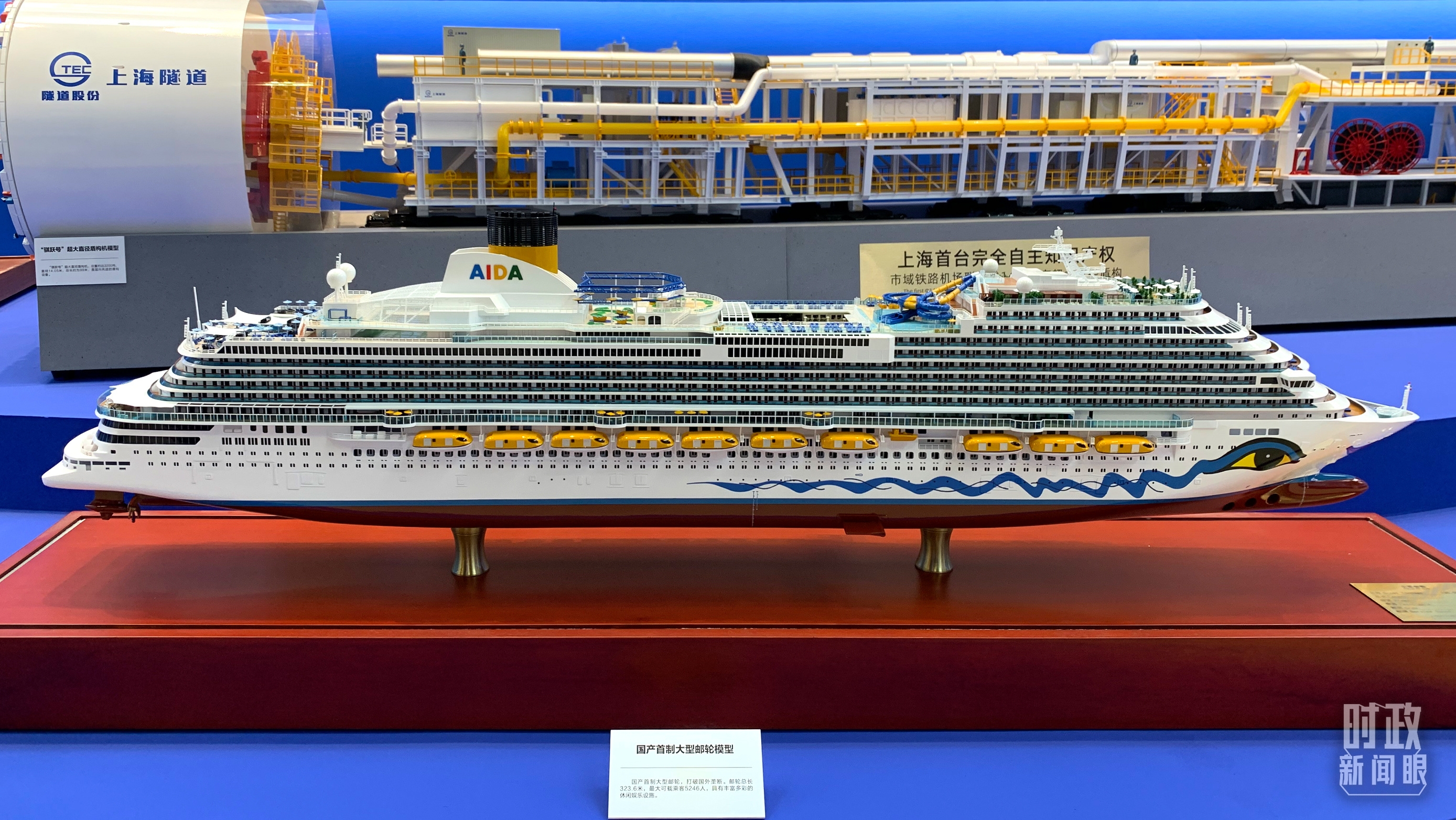 △ 国产首制大型邮轮模型。邮轮总长323.6米,最大可载乘客5246人。(总台央视记者韩锐拍摄)