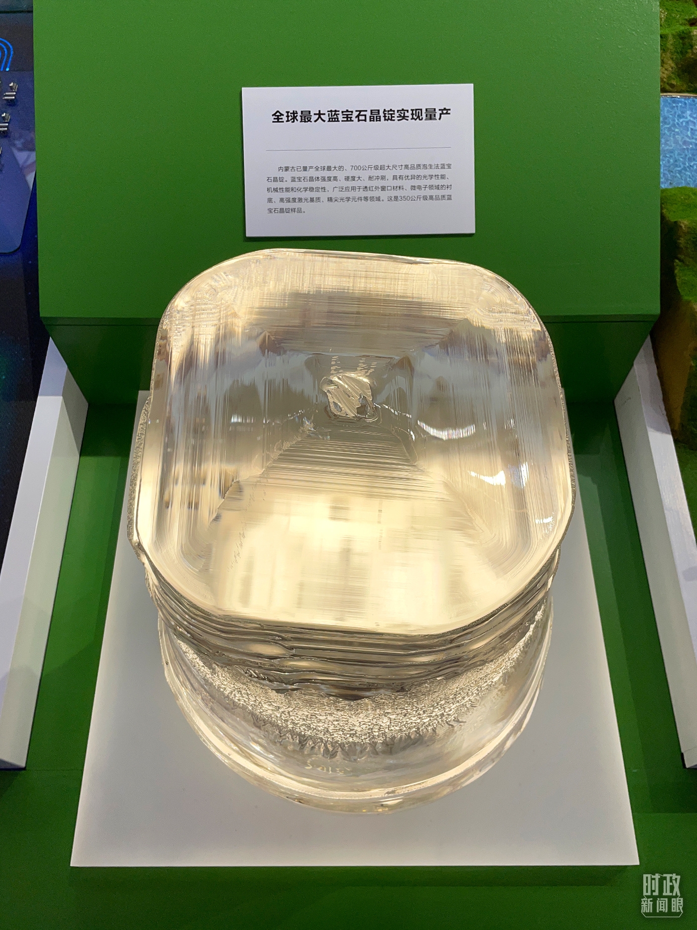 △ 这是350公斤级高品质蓝宝石晶锭样品。蓝宝石晶体强度高、硬度大、耐冲刷,应用于精尖光学元件等领域。(总台央视记者彭汉明拍摄)