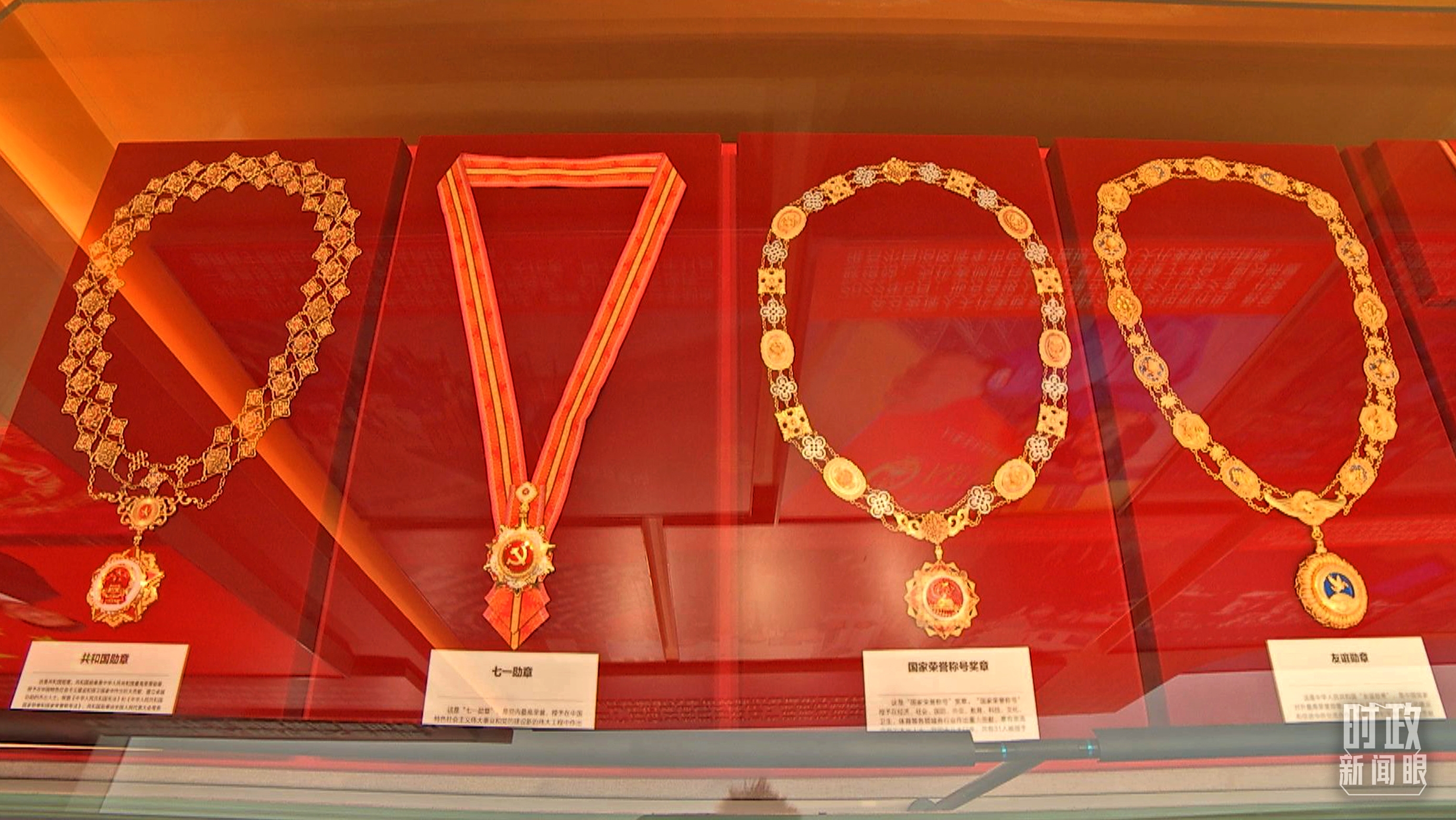 △ 从左至右依次是共和国勋章、七一勋章、国家荣誉称号奖章、友谊勋章。(总台央视记者彭汉明拍摄)