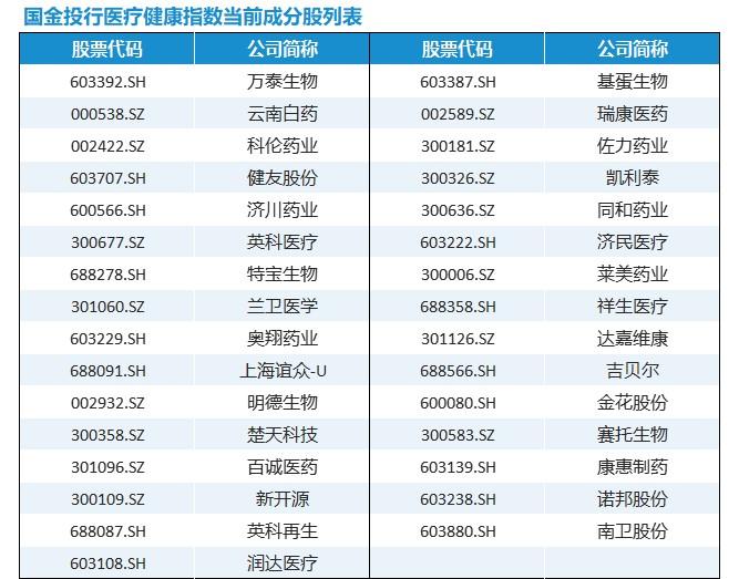 该指数聚焦医药制造、器械制造、药品批发、中药等医疗健康子版块,成分股包含上游原料药、科研服务相关公司,也包含了中下游主营医药制造、药品批发的相关公司。
