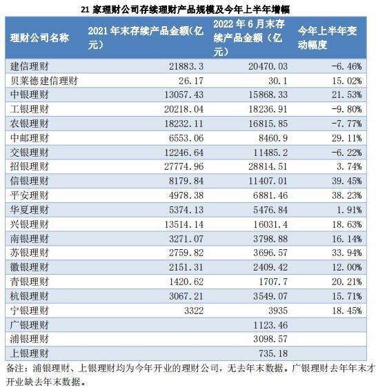 截至2022年6月末,21家已披露2022年上半年理财业务报告或相关数据的理财公司合计管理的理财产品规模达18.1万亿,部分已披露报告的理财公司可能因报告未公开而未统计在内。其中,有去年末数据的18家理财公司合计管理17.91亿,今年上半年规模增长6.57%。