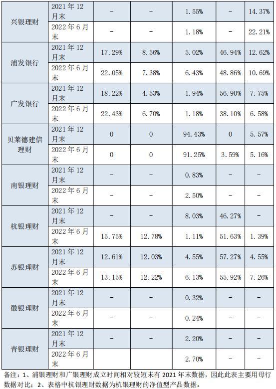 广发银行的2022年上半年理财业务报告显示,今年上半年广发银行的非标资产占比由4.53%增加到6.7%。由于广银理财和浦银理财成立时间不长缺少去年末数据,并且广发银行和浦发银行向理财子公司划转理财产品还在进行当中,还有不少理财产品在母行,因此我们重点选取母行数据对比观察。
