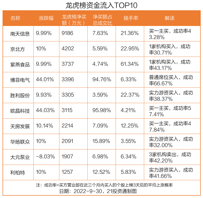 9月30日,上证指数下跌0.55%,深证成指下跌1.29%,创业板指下跌1.89%。盘后龙虎榜数据显示,共有36只个股因当日异动登上龙虎榜,资金净流入最多的是南天信息(000948.SZ),达0.92亿元。