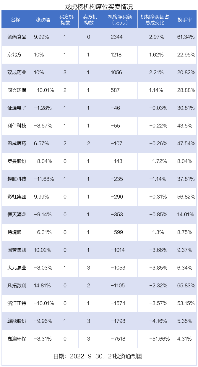 其中,机构净买入金额最多的是紫燕食品(603057.SH),当日收盘上涨9.99%,换手率为61.34%。前五大买卖营业部中仅1家机构,净买入2344万元,占总成交金额的2.97%。