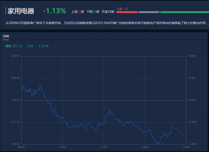 9月29日,截至A股收盘,家用电器板块小幅下跌,南财金融终端数据显示,家用电器主题下跌1.13%,白电股中,长虹美菱涨停,ST奥马平收,其他多股下跌。