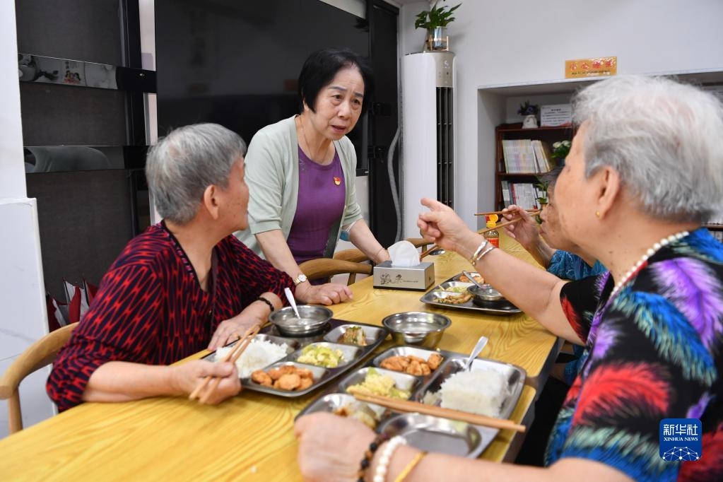 在福建省福州市军门社区长者食堂内,林丹(左二)与用餐的老人交流(2022年9月9日摄)。新华社记者 姜克红 摄