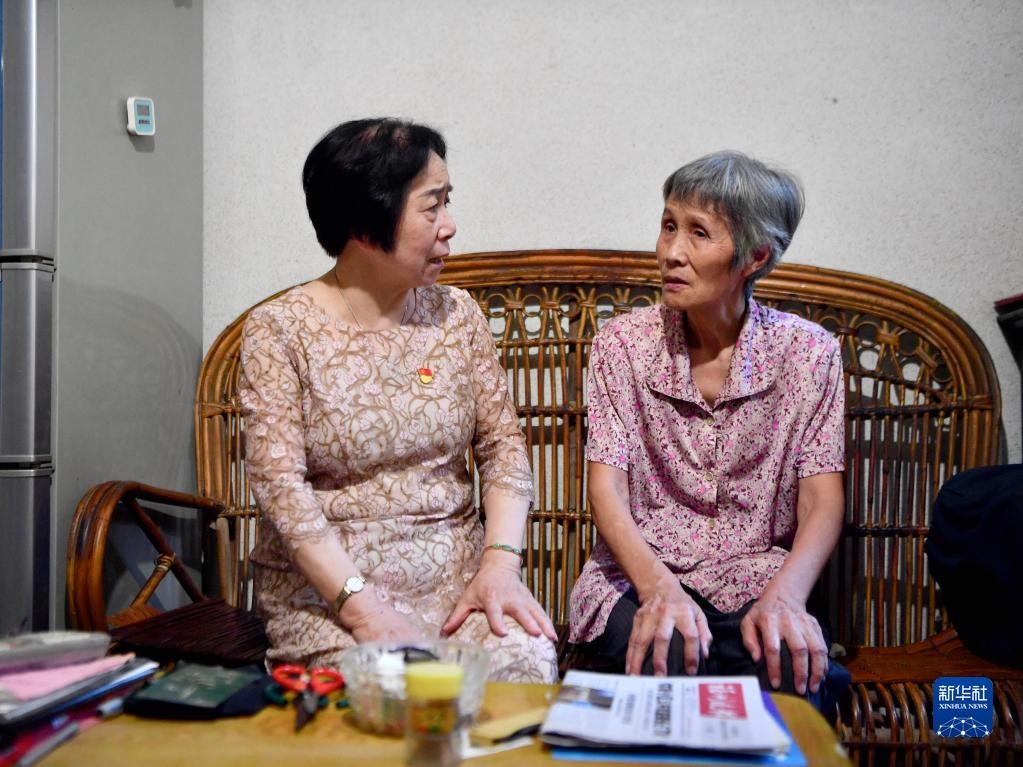 福建省福州市军门社区党委书记林丹(左)在居民高珠英家走访,了解老人生活情况(2022年9月15日摄)。新华社记者 姜克红 摄