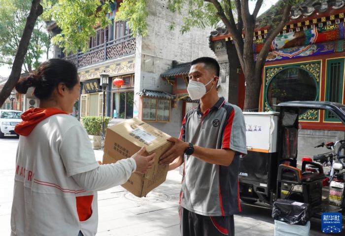 在北京市西城区琉璃厂东街,刘阔把快递送到客户手中(2022年6月25日摄)。新华社记者陈旭摄
