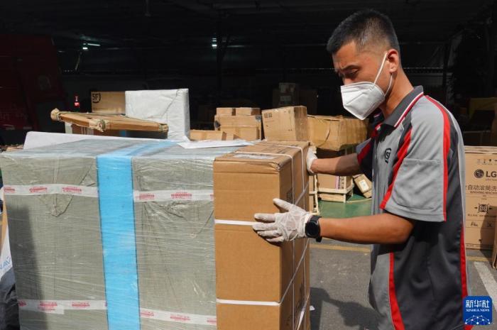 在北京市西城区陶然亭街道一处顺丰速运营业点,刘阔整理刚卸下的大件货物(2022年6月25日摄)。新华社记者陈旭摄