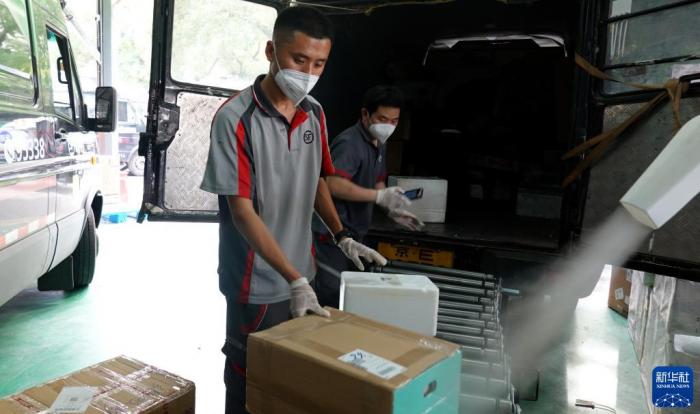 在北京市西城区陶然亭街道一处顺丰速运营业点,刘阔(左)和同事用传送带卸货并进行外包装消毒(2022年6月25日摄)。新华社记者陈旭摄
